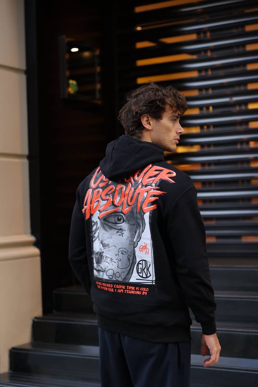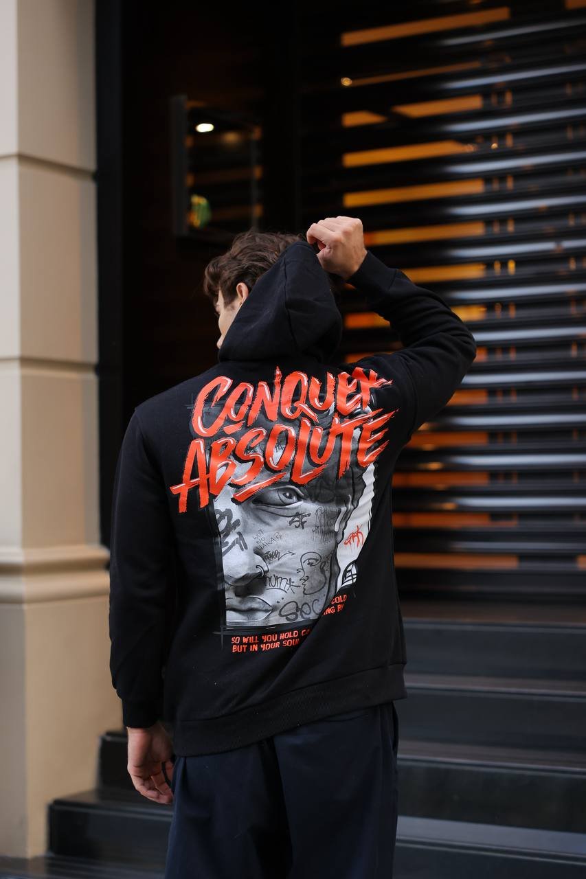 • The Back Statement: The hoodie features a massive and distinctive graphic print on the back, displaying the bold phrase “CONQUER ABSOLUTE” in fiery red. This is integrated with a modern graffiti-style face graphic, drawing inspiration from street art culture for a strong, attention-grabbing aesthetic.