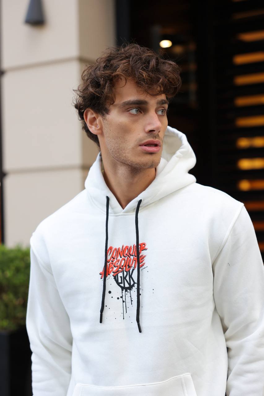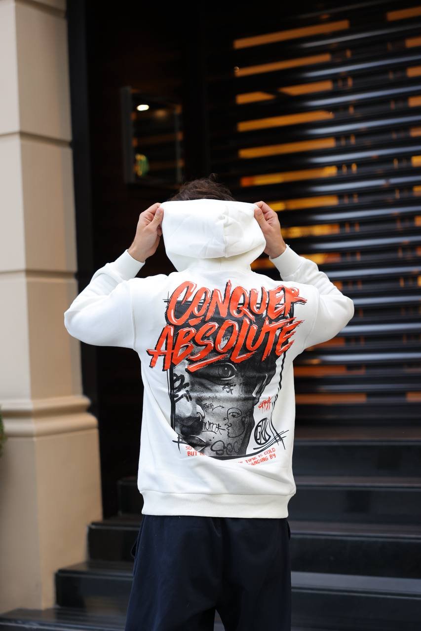 The CONQUER ABSOLUTE Hoodie is a contemporary streetwear piece crafted from premium sweat fabric with a fleece lining, combining absolute warmth with superior comfort. It features a bold, large graphic print on the back and a modern, splash-style logo on the front. Perfect for a striking winter look