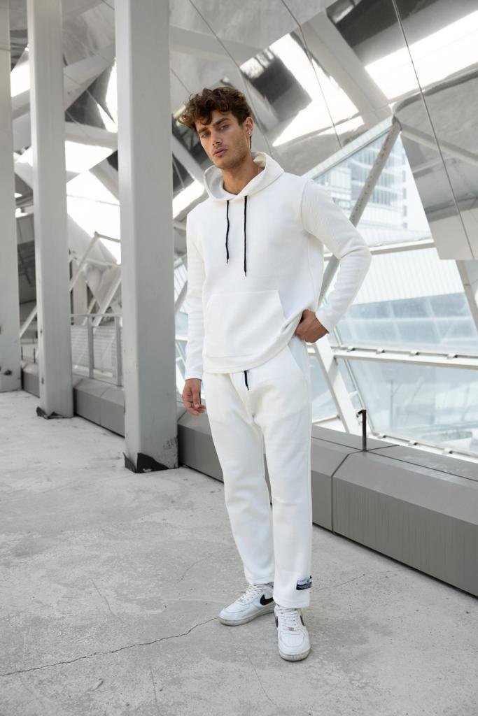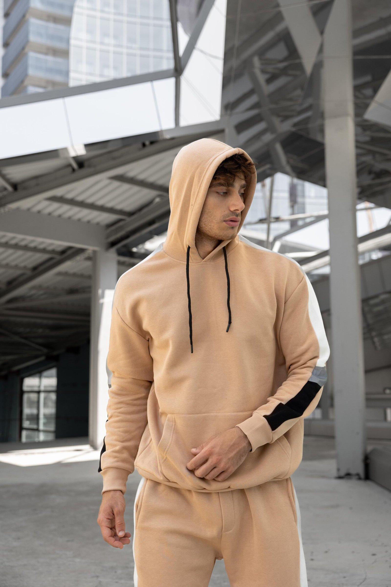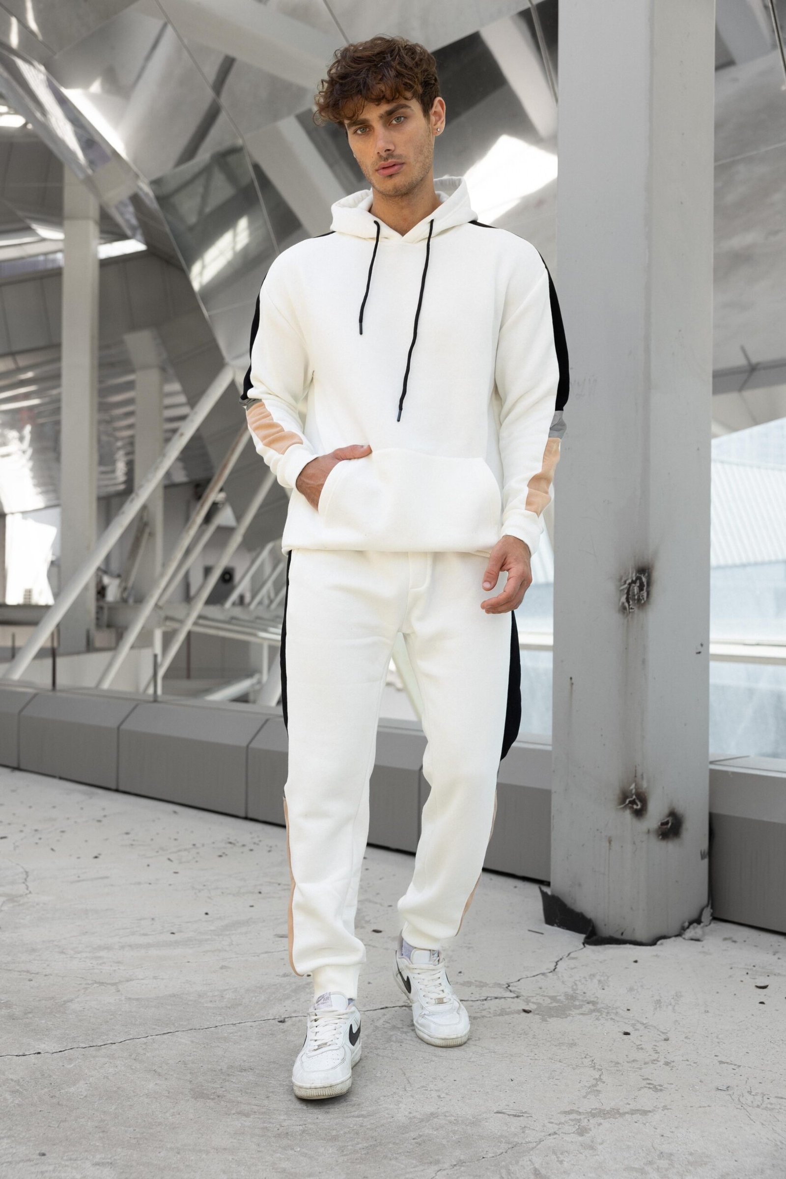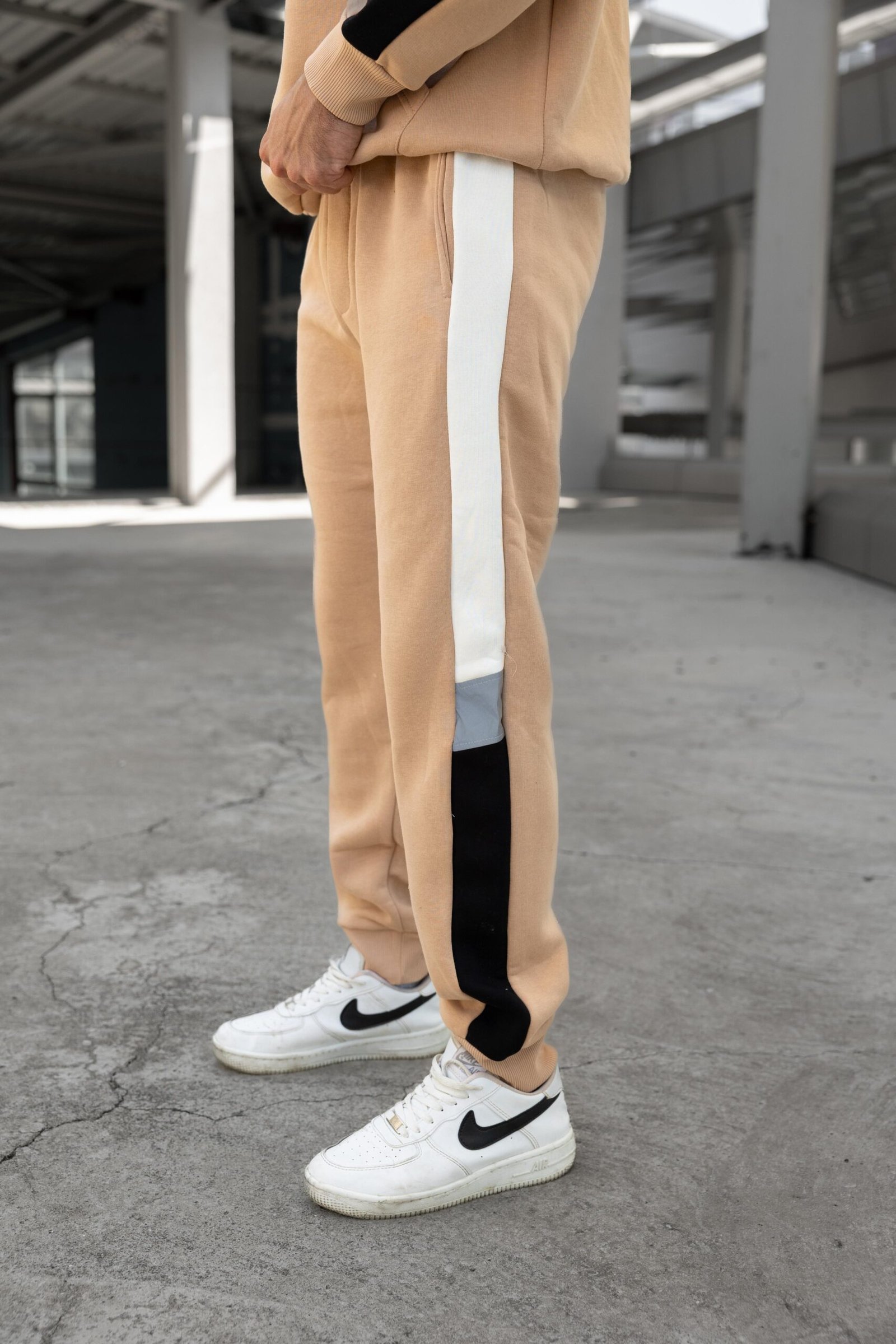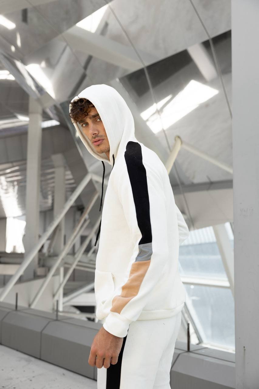 The standout feature is the dynamic side-paneling, combining bold black and beige accents with a high-visibility reflective strip that catches the light—perfect for evening runs or making a statement in the city. The set includes a relaxed-fit hoodie with a kangaroo pocket and matching joggers with cuffed ankles for a clean, tapered look.